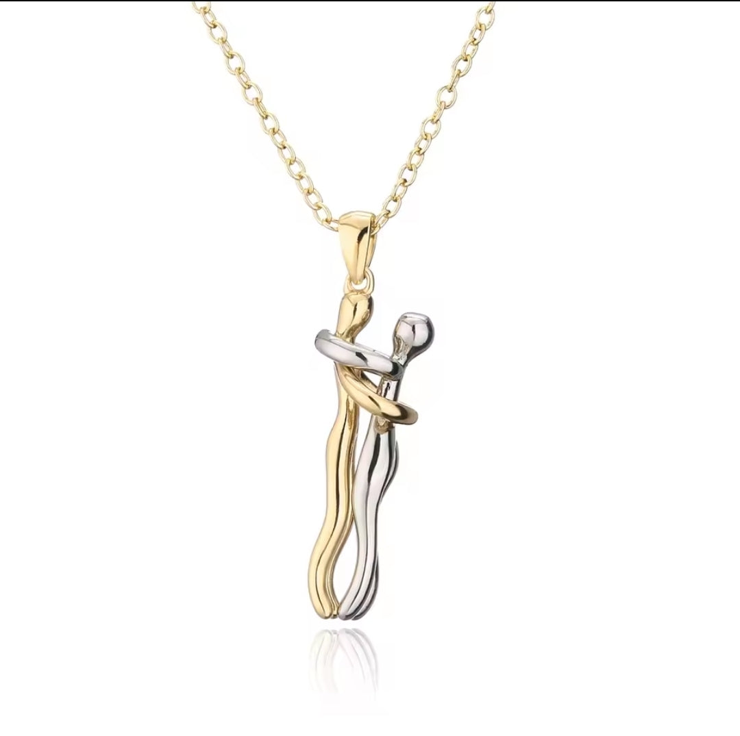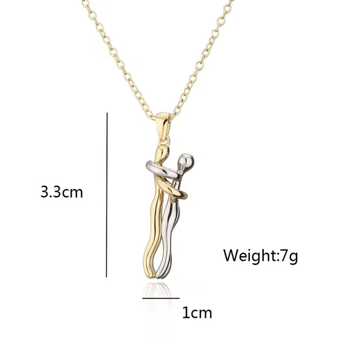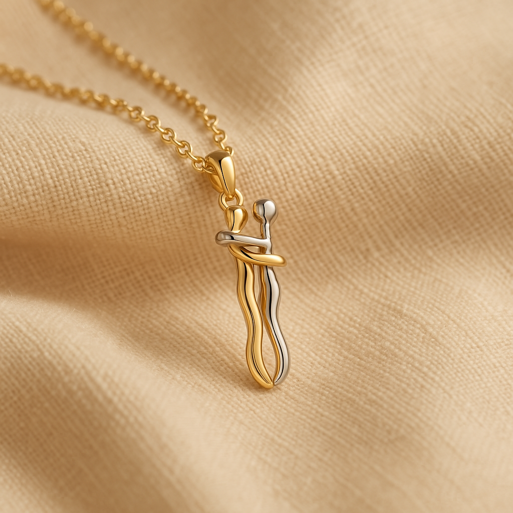 Le due figure, in oro e argento lucente, si intrecciano con equilibrio e grazia, raccontando una storia d’amore, amicizia o legame autentico.